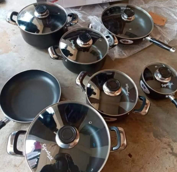 13 piece signature cookware set, comprises of 13 pieces high quality non sticky durable pots ideal for all cooking solutions.